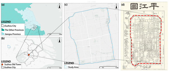 Suzhou old town location. (a) Jiangsu Province, China; (b) map of Suzhou; (c) map of Suzhou old town; (d) Pingjiang Map of Suzhou (1229 AD—the earliest and most complete existing city plan in China).