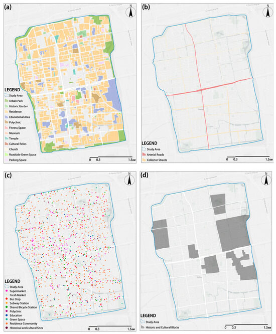 SAVs are widely seen as one of the most promising innovations to transform traditional transportation systems [24]. In old town areas, residential environments are often outdated and lack comfort, while the mismatch between emerging transport technologies and existing infrastructure creates an urgent need for transportation system upgrades. Issues such as inadequate infrastructure, poor-quality street networks, and suboptimal travel experiences for both residents and tourists remain pressing concerns. As a renowned historical and cultural city in China, Suzhou’s old town is characterized by its compact street grid, high-density built environment, and abundant cultural heritage. These features present unique challenges for the integration of SAVs into the urban fabric (Figure 4a–c).