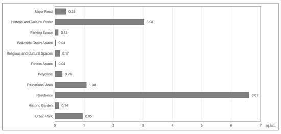 The dominant land uses include residential areas and public administration and service facilities, as well as commercial and business-related functions. The spatial structure of Suzhou’s old town is characterized by a water-oriented urban fabric: rivers form the structural backbone, while roadways are organized around a dual-grid system aligned with the water network [32].