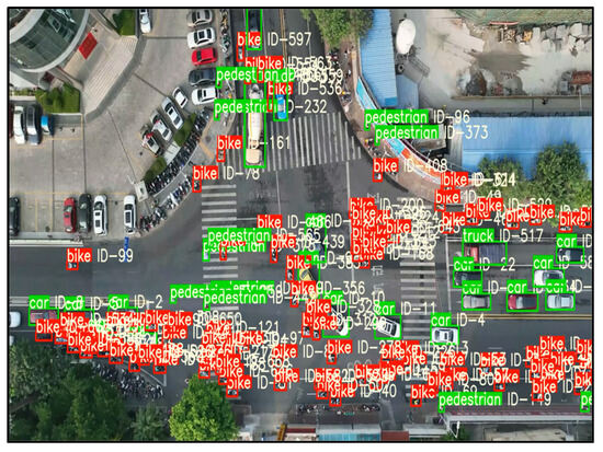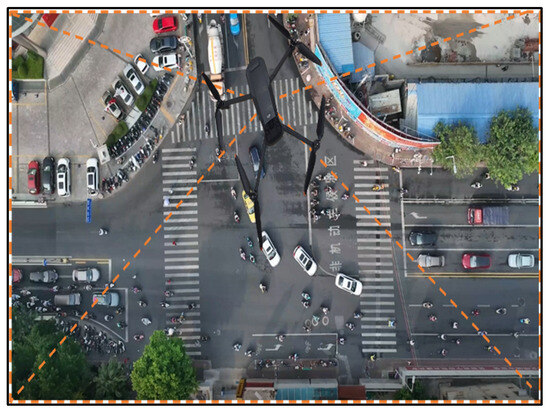 To obtain high-quality training samples, this study employed DJI Mavic 3 series unmanned aerial vehicles to conduct field aerial photography at several typical unsignalized intersections in Guilin City, Guangxi Province, collecting high-resolution video data involving multiple types of traffic participants, as shown in Figure 1. Subsequently, based on the YOLOv7 object detection algorithm and the DeepSort multi-object tracking algorithm, this study performed target identification and trajectory tracking of various traffic participants in the videos (see Figure 2), obtaining the initial trajectory data of vehicles and pedestrians. On this basis, after data filtering and processing, an interactive dataset containing the trajectories of 500 pedestrians was constructed. The dataset records traffic dynamic information at a frequency of 30 frames per second, covering key parameters such as interaction event identifiers, pedestrian longitudinal and lateral coordinates, velocities and accelerations, vehicle positions, velocities and accelerations, as well as the relative distances between pedestrians and vehicles, providing essential data support for subsequent trajectory modeling and collision risk prediction.