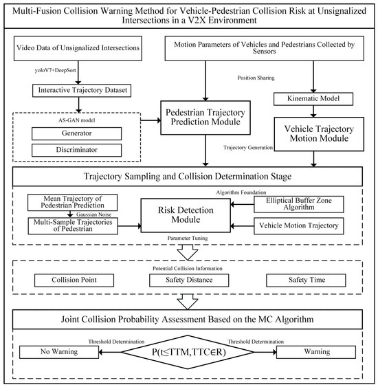 In summary, pedestrian behavior at unsignalized intersections, which are characterized as high-risk scenarios, exhibits considerable uncertainty. Furthermore, traditional collision warning methods suffer from limited capability in modeling trajectory diversity and rely on single risk assessment mechanisms, resulting in inadequate adaptability and warning accuracy in complex mixed traffic environments. To address these challenges, this paper focuses on potential conflicts between vehicles and pedestrians and proposes a multi-fusion collision warning method under the Vehicle-to-Everything (V2X) communication environment, aiming to enhance the traffic safety protection of vulnerable road users (VRUs) in typical unsignalized scenarios. Specifically, the proposed method employs the Monte Carlo (MC) algorithm as the core framework, integrating the social generative adversarial network (Social GAN) and a soft attention mechanism to achieve robust pedestrian trajectory prediction in complex traffic interaction scenarios. Trajectory samples are generated by adding Gaussian noise to the mean trajectory to support the warning algorithm. Moreover, an elliptical buffer zone algorithm is employed to dynamically construct the risk detection module, achieving a collision detection mechanism that balances accuracy and computational efficiency. This study systematically advances from behavior modeling and risk assessment to warning decision-making, with the objective of improving pedestrian risk identification and collision warning capabilities at unsignalized intersections, thereby providing theoretical foundations and technical solutions for enhancing road traffic safety.