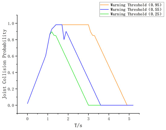In the single-vehicle accident simulation experiment, this paper selects joint collision probability thresholds of 0.25, 0.55, and 0.95 to analyze the performance of the warning system under different collision probability conditions, as shown in Figure 7.