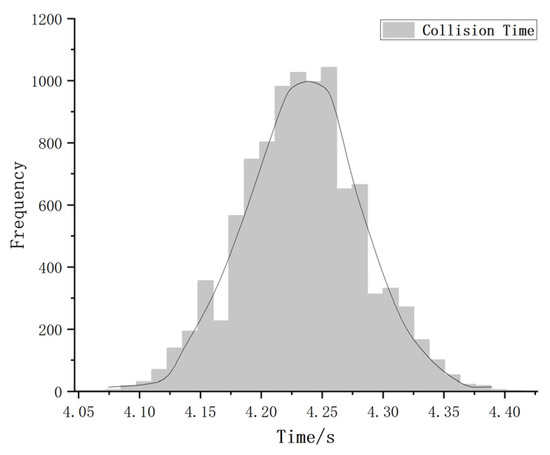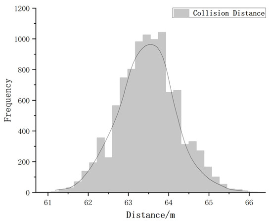 Figure 9 and Figure 10 show the distribution of future collision time and future collision distance calculated by the multi-fusion warning method at simulation time T = 0 s. Both collision distance and collision time exhibit a clear normal distribution trend. In Figure 9, most of the sampled collision times are close to 4.2 s, indicating that the collision time is mainly concentrated within this time range. Figure 10 shows that the collision frequency between the vehicle and the pedestrian peaks within the distance range of 63 m to 64 m, indicating that the collision risk significantly increases within this distance interval. In conclusion, the mean of the distribution indicates that the future collision time between the vehicle and the pedestrian is 4.2 s, or the future collision distance is 63.5 m, which also indicates the existence of a potential high-risk collision point.