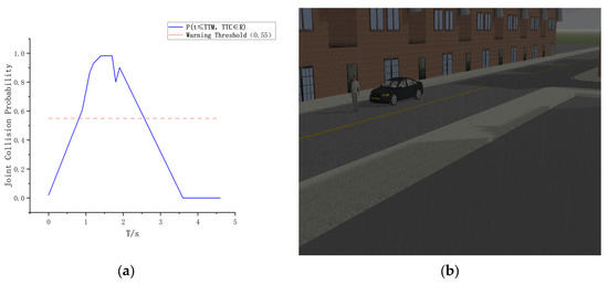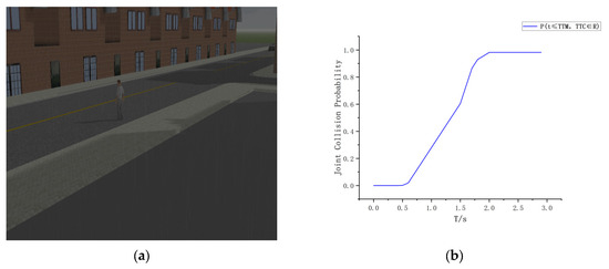 As shown in Figure 11, at T = 1 s, the vehicle begins to detect the pedestrian, and the joint collision probability starts to gradually increase. Figure 11a shows the simulation scenario at this time, and Figure 11b displays the change curve of the joint collision probability. At this point, the joint collision probability has not yet exceeded the warning threshold of 0.55, and the system is in monitoring mode.
