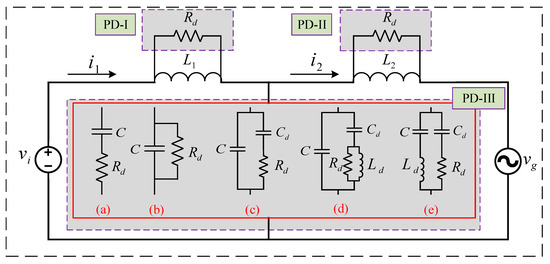 The mitigation of resonance peaks in GCIs primarily employs two approaches: active damping (AD) and passive damping (PD) [5]. PD incorporates resistive elements into the LCL filter, offering simplicity but incurring undesirable power losses [6]. PD methods can be classified into three main categories, as shown in Figure 1. The basic configurations include PD-I (resistor across inverter-side inductor), PD-II (resistor across grid-side inductor), and PD-III(a) (series resistor with filter capacitor). These approaches effectively suppress resonance peaks with simple implementation but compromise HF attenuation and incur power losses [7]. An improved variant, PD-III(b), places a parallel damping resistor across the filter capacitor to enhance HF performance, though at the expense of increased losses due to PCC voltage effects [8]. PD-III(c) employs a shunt RC branch across the capacitor to maintain HF attenuation while minimizing losses through optimized capacitor splitting [9]. The PD-III(d) configuration introduces a shunt RLC circuit with an additional damping inductor that bypasses fundamental current components, significantly reducing power dissipation [10]. Similar benefits are achieved in PD-III(e) using series RLC dampers or trap filters, which also enable size reductions in filter inductors while suppressing multiple resonances [11]. These advanced methods demonstrate the ongoing trade-off between resonance control, harmonic attenuation, and system efficiency in passive damping solutions.