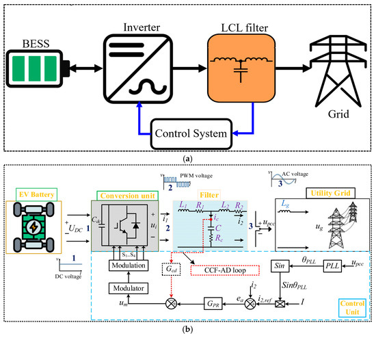 Single-phase LCL-filtered EV battery GCI system: (a) block diagram; (b) schematic diagram.