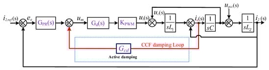 Figure 4 showcases the simplified linearized model of the GCI system illustrated in Figure 3b, encompassing the internal damping loop of the CCF-AD method. In this configuration, the capacitor current is employed as feedback, regulated by a coefficient, to mitigate the intrinsic resonance peak within the LCL filter. This approach allows for the real-time adjustment of damping characteristics, enhancing the overall performance of the system. The relationship between the grid and capacitor currents to the voltage of the inverter can be described by the following transfer functions (component parasitic resistances () are ignored to consider the worst stability case):
