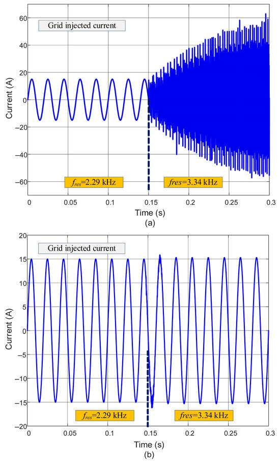 To evaluate the performance under resonance frequency variations, both controllers are first tested using the nominal LCL filter parameters from Table 2, which yielded a resonance frequency of 2.29 kHz. Under these conditions, both control methods successfully attenuated the resonance peak, producing stable output waveforms with THD below 5%, as shown in Figure 10a,b. However, when the filter capacitance was abruptly reduced by 60% at t = 0.15 s (increasing the resonance frequency to 3.34 kHz), the conventional CCF-AD method failed to maintain effective damping. This failure resulted in severe waveform distortion with THD soaring to 177%, along with visible instability in the output current. In contrast, the proposed μ-synthesis-based CCF-AD method dynamically adapted to the parameter change by accurately estimating and feeding back the modified capacitor current. This adaptive capability enabled the system to maintain excellent performance, with the output waveform remaining stable and achieving a low THD of just 3.7%. These results clearly demonstrate that the μ-synthesis approach provides superior robustness against resonance frequency variations compared to conventional fixed-gain methods, making it particularly suitable for practical applications where parameter drift may occur due to component aging or operating condition changes. The capacitor current waveforms are intentionally omitted from the presented figures due to their relatively small magnitude compared to the grid current.