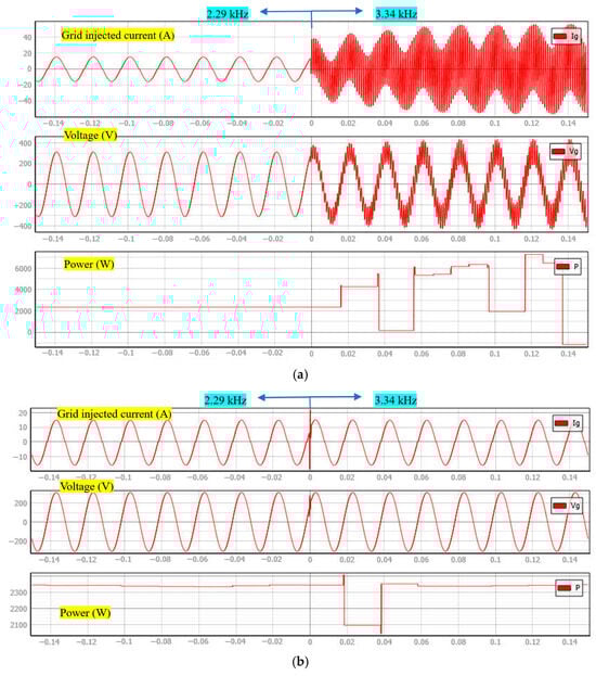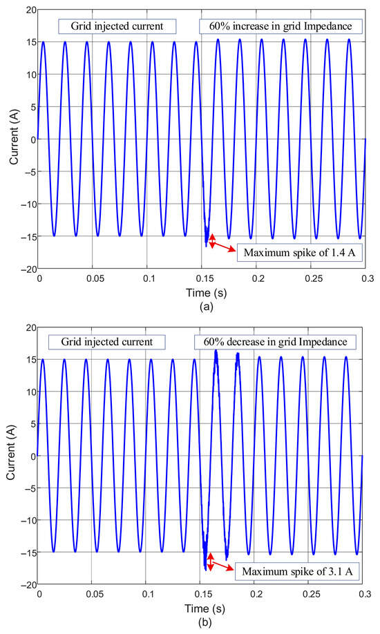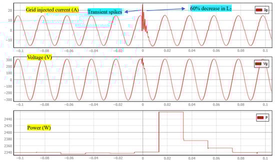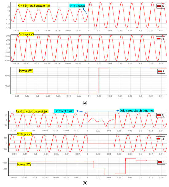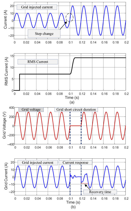 The transient performance of the proposed μ-synthesis-based CCF-AD controller is thoroughly evaluated through two critical tests, as shown in Figure 11. In the first test, as illustrated in Figure 11a, the system is subjected to a 100% step change in reference current from 10 A to 20 A at t = 0.1 s. The grid-injected current demonstrates exceptional tracking performance, following the reference command precisely without any overshoot or significant transient disturbances. This rapid and stable response confirms the controller’s ability to handle large signal variations while maintaining system stability.