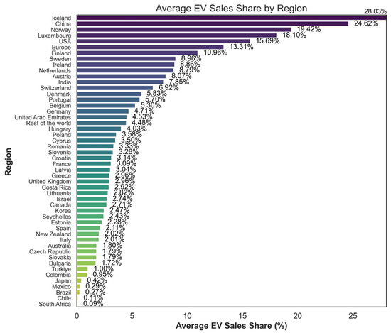 Parameters within this dataset include critical indicators of EV market evolution, such as annual sales volumes; cumulative EV stock; market penetration percentages (EV sales share and EV stock share); infrastructure indicators (number of charging points categorized into fast and slow charging); and energy metrics, including electricity demand and oil displacement. Further dimensionality is provided through classifications by vehicle mode (cars, buses, trucks, and vans) and powertrain technologies, specifically battery electric vehicles (BEVs), plug-in hybrid electric vehicles (PHEVs), and fuel-cell electric vehicles (FCEVs). Measurement values are accompanied by relevant units, offering clear interpretability and ease of integration into analytical frameworks. Average EV sales share by region/country is shown in Figure 2.