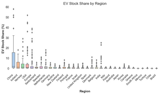 At the core of the dataset are EV sales and stock figures. Annual EV sales reflect immediate, year-over-year fluctuations in adoption levels, often influenced by government incentives, new model availability, fuel price dynamics, or consumer sentiment. These sales data provide the short-term responsiveness signal that a temporal model can learn from. In contrast, cumulative EV stock represents the total number of electric vehicles in operation at any given time, serving as a proxy for long-term adoption, infrastructure demand, and entrenched behavioral shifts. Figure 3 shows the distribution of EV stock share by region, highlighting variability and outliers across major markets.