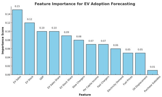 To develop an effective multi-branch LSTM model with attention mechanisms for forecasting EV adoption, a structured and methodical preprocessing pipeline was implemented to ensure data quality, consistency, and temporal coherence. This was followed by the strategic application of the preprocessed data to address key limitations of existing EV forecasting models. Feature importance scores for EV adoption forecasting are shown in Figure 4.