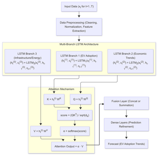 The integration of these innovations provides the theoretical foundation for our proposed forecasting architecture, which leverages a multi-branch LSTM network combined with hierarchical attention layers. This design not only enhances the model’s ability to capture complex, multi-scale dynamics in EV adoption but also offers clear interpretative insights by highlighting the contributions of various input streams and time periods.