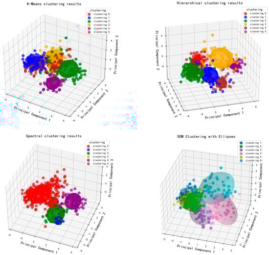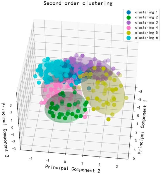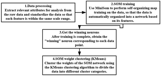 According to the above results, it is found that the clustering effect of K-means and SOM is better, in this regard, this paper combines the two algorithms for the second-order clustering strategy. Firstly, the data are implicitly projected by SOM, and then clustered by K-means, which can combine the nonlinear mapping ability of SOM and the efficient clustering characteristics of K-means to make up for the shortcomings of the separate method, which is shown in Figure 5. SOM can handle the nonlinear relationship of data and provide a more suitable input data space, while K-means can efficiently perform clustering based on this, enhancing the accuracy and stability of the clustering. Furthermore, the contour coefficient of the second-order clustering of SOM and K-means is 0.6785764, that of SOM is 0.5111238, and that of K-Means is 0.4378564, reflecting the excellent performance of the second-order clustering.