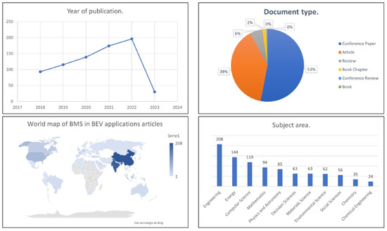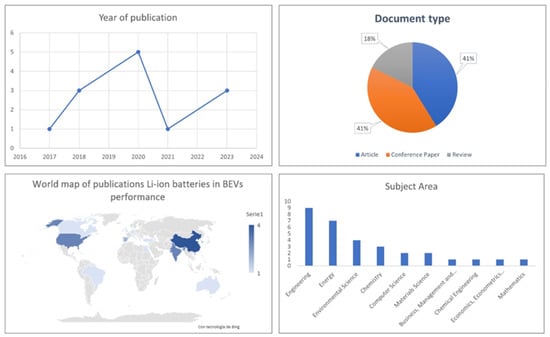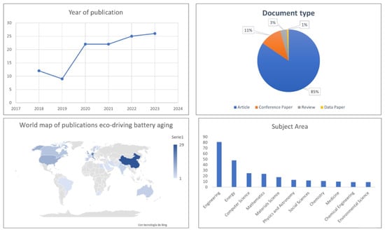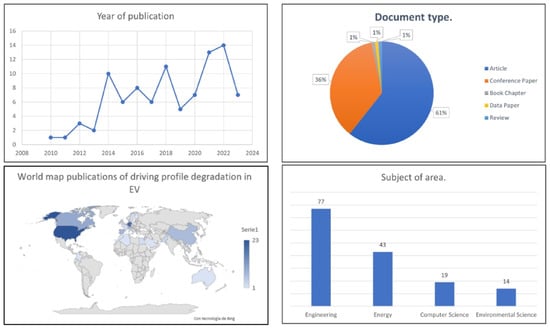 Figure 2 shows the volume of related publications over time, indicating a consistent increase in research activity and the growing relevance of driving degradation profiles. Figure 3 identifies the contributions most significant to the literature, focusing on global research on driving performance. Figure 4 presents the most relevant keyword searches related to this paper, highlighting the primary areas of interest in BMS. Finally, Figure 5 maps the distribution of scientific contributions, revealing key regions leading in this area of study of Li-ion batteries.