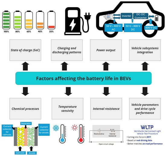Consequently, to achieve comparable energy output to an ICE vehicle, new techniques are developed that often require more batteries. This introduces a second challenge: the battery pack alone can account for approximately 40% of a BEV’s total weight. This substantial weight negatively impacts vehicle efficiency and necessitates more advanced energy management and safety systems, further increasing manufacturing costs. As a result, a BEV’s operational lifetime is significantly reduced by its performance, which is intrinsically linked to its discharge and charge cycles [6].