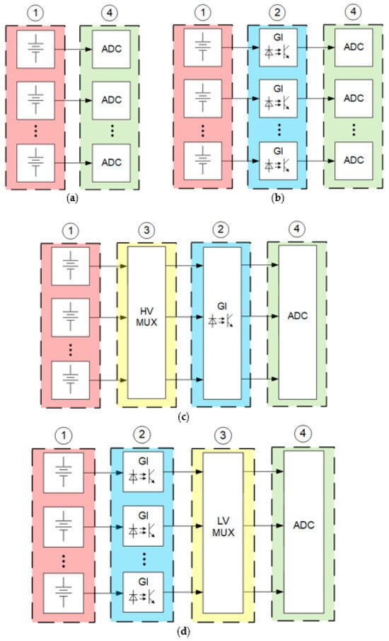 Measuring circuit architecture options to measure the battery cell voltage: (a) direct voltage measurement; (b) voltage measurement employing galvanic decoupling; (c) voltage measurement employing galvanic decoupling and a high-voltage multiplexor; (d) voltage measurement employing galvanic decoupling and a low-voltage multiplexor; 1—battery pack; 2—galvanic decoupling; 3—multiplexer; 4—analog–digital converter.