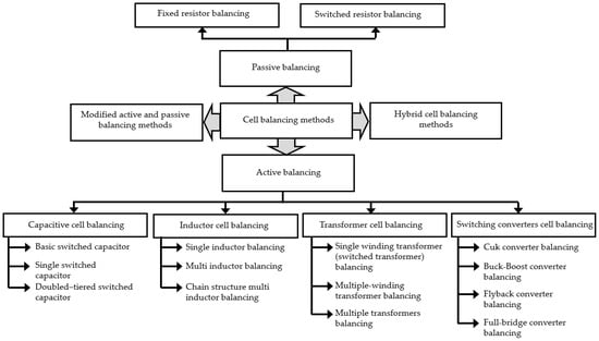 Cell balancing methods are divided into two categories: passive cell balancing and active cell balancing. Each category comprises its own set of methods. Figure 4 shows a general breakdown of cell balancing methods.