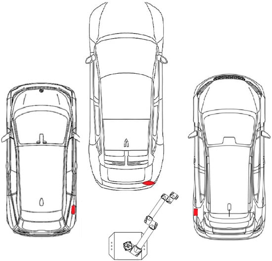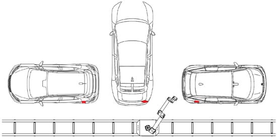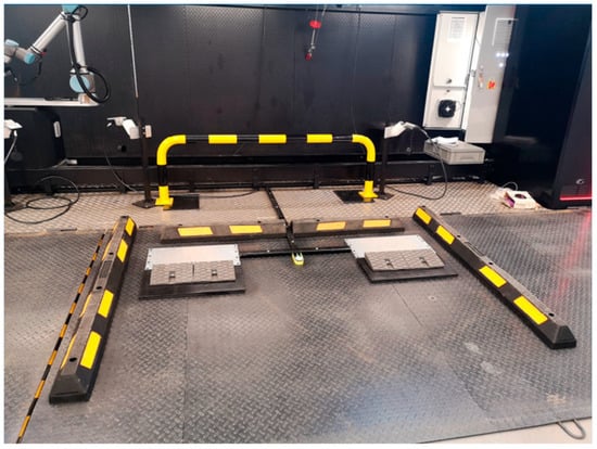 In the case of automatic charging performed by a robotic arm, the parking position of the vehicles is of significant importance, as discussed in several literature sources [,,,,,,,,,,]. In the system presented in this study, the driver must not only ensure the proximity of the vehicle’s charging socket to the robotic arm but also the vehicle’s precise, perpendicular alignment. This ensures that the camera located at the end of the robotic arm can optimally search for the charging socket relative to the vehicle’s position. To aid proper positioning, flexible bumpers have been applied. Additionally, to prevent parked vehicles from coming dangerously close to the charging system, physical barriers have been placed between the rail system and the parking area. The arrangement of these barriers and bumpers is shown in Figure 12.