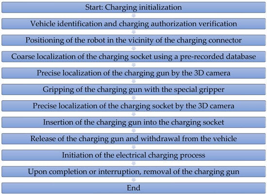 The charging process begins with the identification of the vehicle and the authorization of the charging by the provider, after which the mechanical system positions the charging robot to the vehicle’s charging socket. The position and orientation of the charging socket on the vehicle is stored in a pre-recorded database relative to the wheel closest to the charging port. The robotic arm’s integrated camera then precisely assesses the spatial position and orientation of the charging pillar with the charging gun, and the vehicle’s charging socket. The robot then uses a specially designed gripping mechanism to grasp the charging gun, inserts it into the charging socket, and, after a secure connection is made, releases the gun and moves away from the vehicle. At this point, the charging station automatically initiates the charging process. Upon completion of the charging or its interruption for any reason, the robot removes the charging gun from the vehicle in a manner similar to the previously described steps and returns it to the charging pillar. During the robot’s movement, the system continuously monitors the work area and, if human presence or another unexpected obstacle is detected, immediately halts the movement or, if necessary, returns to a safe default position.