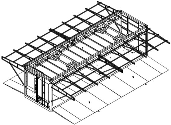 To ensure ease of transportation and rapid deployment—particularly for events, exhibitions, or other demonstrations—the system was integrated into a transport container compliant with ISO standards. All components are mounted within the container, and both sides—designated as parking areas—are covered by a modular roof. The electronic components and the charging gun, along with its holder, are housed inside the container, thereby providing protection against environmental factors such as dust, water, and other weather-related conditions. In order to enable the simultaneous charging of four vehicles, a layout was designed that allows two vehicles to be positioned on each of the container’s longer sides. The length of the container was determined based on the width of the vehicles, resulting in the selection of a standard nine-meter-long unit []. The container’s foldable side panels were designed to function as ramps, allowing vehicles to easily drive onto the platform (Figure 4).