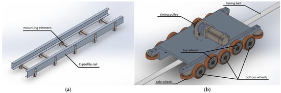 Taking these factors into account, the longitudinal motion was implemented using the rail-and-carriage configuration shown in Figure 6. The rail was constructed from a C-profile steel section with a cross-sectional height of 160 mm and a width of 65 mm, mounted using steel fasteners. The rail system was deliberately over-engineered with a robust design—including dense support placement and a thick steel profile—to ensure that any deflection remains negligible. The carriage module was equipped with seven wheels on each side, fulfilling three principal functions: the lower three wheels supported the structure’s weight, the upper two provided anti-tip protection, and the lateral two ensured linear guidance along the rail. Similar systems are commonly used in industrial settings for material and goods transport, such as the Dambach MONOFLEX rail-guided vehicle system [].