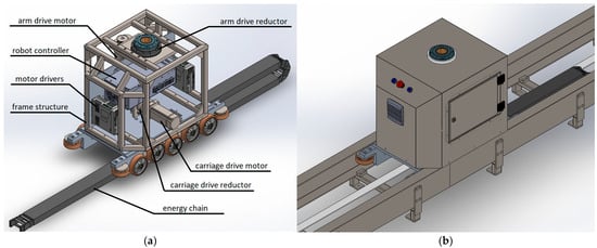 The task of the carriage, in addition to the robot’s longitudinal movement, is also the storage of the system’s electronic components. For this purpose, a frame structure made of welded steel profiles was designed on the carriage. The motors, reducers, and drives responsible for the movements, the robot’s control unit, and other electronic components were placed within this frame structure (Figure 7a). The carriage is connected to the control computer by a sliding-type energy chain located at the center of the rail system. In order to protect it against dust and moisture, the frame structure was provided with a steel sheet cover (Figure 7b). The cover is equipped with a service door and ventilation openings to ensure access to electrical components and proper ventilation.