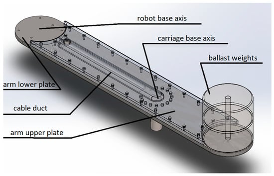 The arm consists of two aluminum parts (lower and upper plates), with the robot’s signal and power cables routed through the middle section. To compensate for the robot’s weight, ballast weights were placed at the opposite end of the arm. The mass of these weights was determined through dynamic simulations. This joint is also driven by a 750 W servo motor; however, the reducer has a special 1:100 ratio with a hollow shaft harmonic drive []. The advantage of harmonic reducers is their extremely high gear ratio and minimal backlash relative to their compact size, making them an ideal choice for this task []. Additionally, the cables for the robot can be conveniently routed through the hollow shaft located at the center of the reducer.