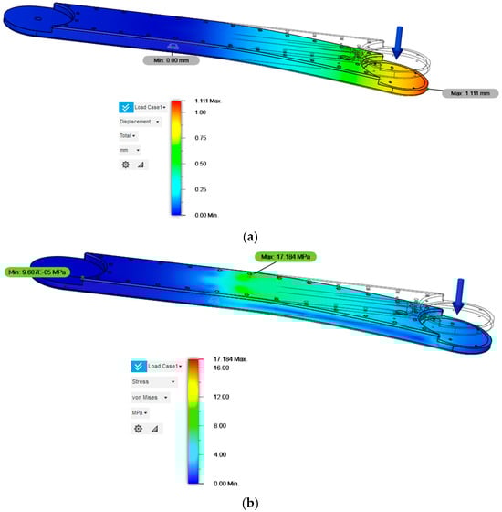 (a) The deflection of the extendable arm and; (b) the resulting internal stresses under a 700 N load.