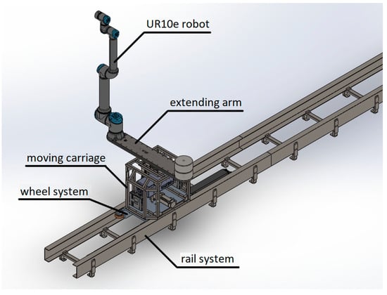 The solutions presented previously ensure the robot’s longitudinal positioning relative to the vehicles. However, the 1300 mm work area of the UR10e robotic arm is insufficient on its own to reach the charging sockets located at various points of the vehicles. The reason for this, as previously mentioned, is the significant variation in the charging socket positions of the vehicles to be charged. The variability of the placement of the charging sockets, their non-uniform positioning, and the resulting problems are detailed in the study []. Therefore, it was necessary to develop a solution that allows the robotic arm to move crosswise, i.e., in a direction perpendicular to the track. This could be achieved using a mechanical movement device-extending arm mounted on the frame of the carriage. Telescopic mechanisms are often used for such tasks (for example, the telescopic fork unit presented in []); however, they are complex and unnecessarily complicate the system.
