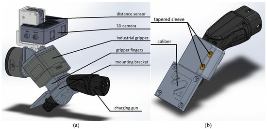 In addition to positioning the charging gun in the correct position and orientation, the safe grasping and releasing of the gun also presented a challenge that needed to be addressed. For this purpose, a special mechanism had to be developed, capable of performing the task with appropriate safety and precision. This mechanism is composed of a Schunk industrial gripper [], custom-designed fingers (Figure 11a), and a clamp that fits the charging gun (Figure 11b).