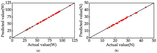 Figure 6. In this figure, a black line passing through the origin at a 45-degree angle represents points where the predicted values equal the actual values. The sample points for both the cogging force and no-load regenerative power are closely distributed around this line. This demonstrates that the prediction errors between the neural network surrogate model and the finite element simulation results are minimal. Therefore, the neural network surrogate model developed in this study is employed to replace the finite element simulation model for key parameter optimization of the linear generator.