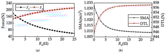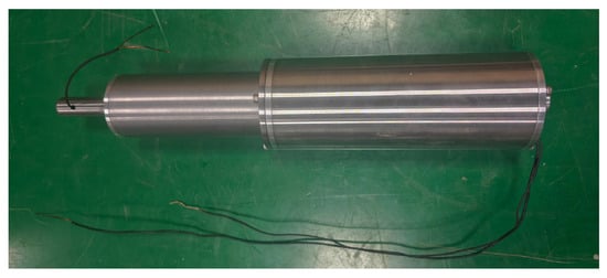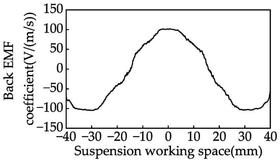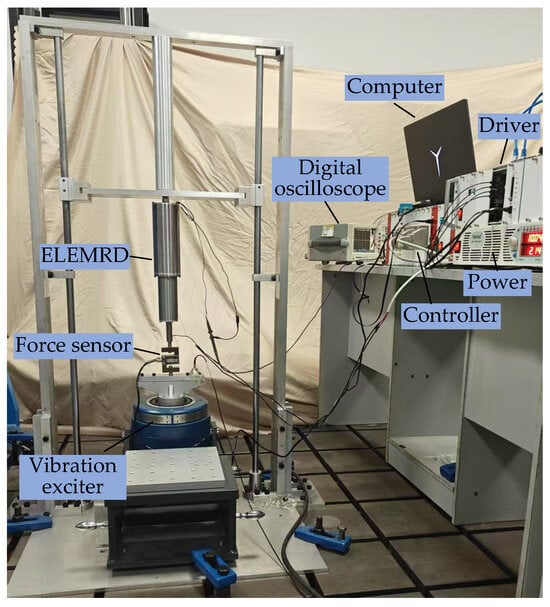 Figure 10. It mainly consists of a vibration exciter, the ELEMRD prototype, a controller, a power supply, a driver, a digital oscilloscope, and a force sensor. One end of the ELEMRD is connected to the test stand beam, while the other end is attached to the vibration exciter. The designed prototype has a diameter of 80 mm and an axial length of 421 mm, making it suitable for installation within the packaging constraints of a typical passenger vehicle suspension system. The excitation coil of the prototype has a resistance of approximately 1.5