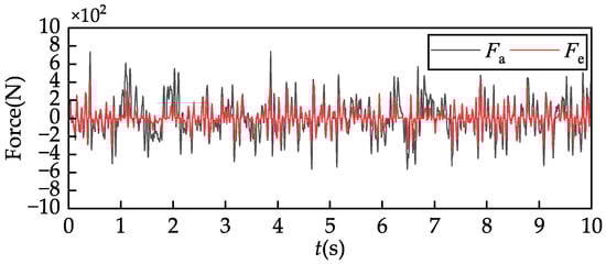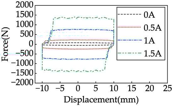 32], the damping performance of the ELEMRD prototype was tested using a harmonic excitation with an amplitude of 10 mm and a frequency of 8.3 Hz. The excitation current of the MRD was set to 0 A, 0.5 A, 1A, and 1.5 A using the controller. The corresponding damping forces under different current levels are shown in