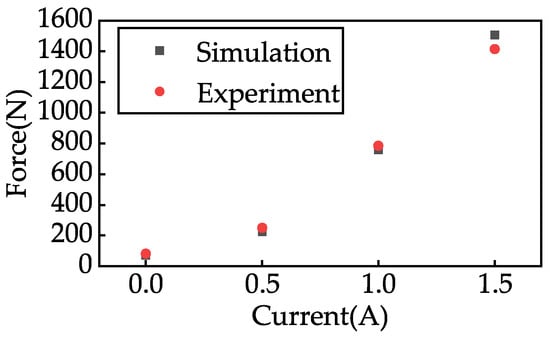 Figure 12 compares the simulated and experimental values of the maximum output force at different current levels. Discrepancies exist between the simulated and experimental results, with errors of 12.5%, 11.6%, 3.2%, and 6.1%, respectively. These discrepancies are relatively complex and mainly arise from four sources: (1) limitations in magnetic field simulation accuracy and the applicability of the Bingham constitutive model; (2) zero-field viscosity deviation and particle sedimentation effects inherent in the magnetorheological fluid; (3) the influence of the nonlinear characteristics of magnetic materials on the actual magnetic flux distribution; (4) structural deviations introduced during the manufacturing and assembly processes. To address these issues, the design process will be further optimized in future work to improve modeling accuracy and enhance the overall reliability of the design.