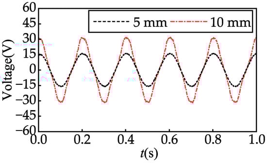 To analyze the energy regeneration performance of the ELEMRD prototype, harmonic excitations with amplitudes of 5 mm and 10 mm and a frequency of 5 Hz were applied. A digital oscilloscope was used to record and store the generated instantaneous voltage signals. The voltage waveforms under the two amplitude conditions are shown in