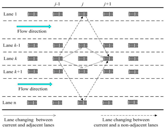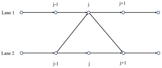 Before discussing the traffic flow behavior of multi-lane highways, we must briefly review the traffic flow modeling process for two-lane systems. In the two-lane scenario shown in Figure 2, both lanes are treated as uniform discrete grid points. Lane-changing occurs when traffic densities at the lattice sites on the two lanes differ. Lane-changing behavior aims to improve driving efficiency. If holds, some traffic flow for lane 2 will shift to lane 1. This movement has a lane-changing rate of . Similarly, if , the lane-changing rate from for lane 1 to + 1 for lane 2 is . The total change in lane-changing rate at lattice site for lane 1 is determined as . Therefore, the continuity equation (conservation equation) for lane 1 in the two-lane framework is obtained as follows [8]:
