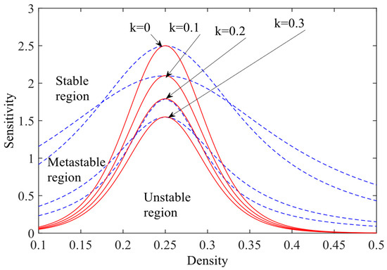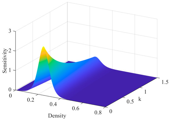 The phase diagram illustrates the variation relationship of the sensitivity coefficient with density and the reaction coefficient k under the conditions of and n = 3.