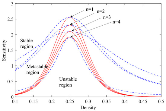 The kink–antikink density wave solution in nonlinear analysis reveals the key characteristics of traffic blockage near the critical point. These features include a free-flow phase at low density and a blockage phase at high density. The coexistence curves illustrate the free-flow phase at low density and the traffic jam phase at high density. Figure 3 and Figure 4 show the coexistence curves. Figure 3 relates these curves to the response coefficients of the OEFDI effect, while Figure 4 links them to the lane count. The nonlinear analysis results also highlight the relationship between the number of lanes and the OEFDI parameters. These factors strongly influence the propagation speed and fluctuation amplitude of the kink–antikink density wave (traffic jam).