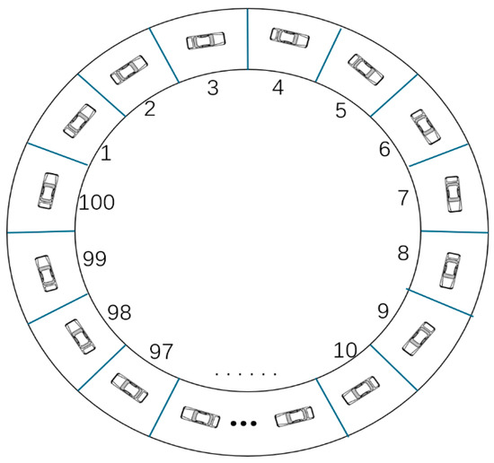 This section presents numerical simulations for the density evolution equation of the multi-lane traffic flow system, represented by Equation (9). The simulation adopts the periodic boundary conditions, as illustrated in Figure 6, where vehicles travel on a circular road with the end of the segment connected to its start. Specifically, when a vehicle reaches the end of the segment, it re-enters from the start; conversely, vehicles exiting from the start will enter from the end. Through this setup, the road segment is transformed into a boundary-free closed system, thereby eliminating the interference caused by vehicles entering or exiting at the boundaries. The initial states were set as follows: