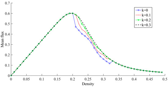 Figure 11 illustrates the relationship between initial density and average flow across varying k values in the new model. Figure 11 shows that OEFDI information has little effect on the multi-lane mean traffic flux in low-density () and high-density () regions. However, when the traffic density exceeds a certain threshold, OEFDI information becomes crucial. It significantly increases the multi-lane average flux. At this point, the flow rate with OEFDI is noticeably higher than when this factor is not considered. Additionally, the multi-lane average flux increases with the value of k.