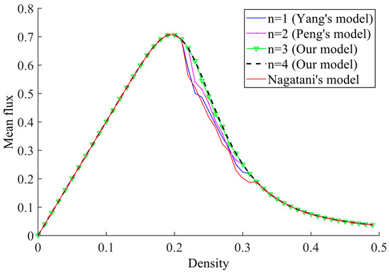 Figure 12 shows the relationship between the system’s mean flux and density. It covers various number of lanes. For the purpose of comparison, the flow curve corresponding to Nagatani’s model is also presented herein. Figure 12 shows that increasing the number of lanes has little impact on mean flux in the free-flow state at low density (). Similarly, it has no significant effect in the jam state at high density (). However, adding more lanes becomes important when vehicle density surpasses the critical point and enters a specific range (). At this point, the average flux increases significantly with the addition of lanes. Traffic efficiency also improves as conditions for lane-changing become favorable. Meanwhile, within this density interval, the proposed model in this paper exhibits a higher flow level compared to Yang’s model, Peng’s model, and Nagatani’s model.