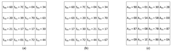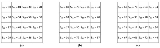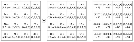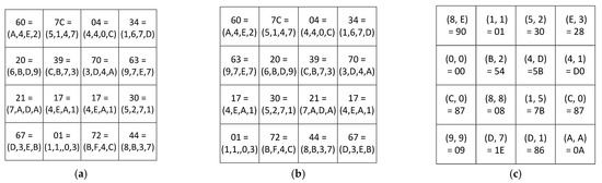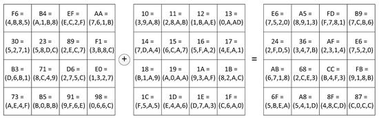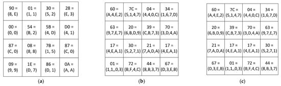 The input byte is represented as S ( x ) = 3 B = ( E ,   9 ,   5 ) . The output byte has the form S ( x ) = E 2 = ( 3 ,   1 ,   5 ) . To detect the error of performing Subbytes transformation, the authors proposed to create three LUTs of size 256 × 4 bits. The first table stores the first residue of the output byte S 1 ( x ) = 3 . The storage rule is defined as T a b l e 1 ( E ,   9 ) = 3 . The storage rule for the second residue S 2 ( x ) = 1 is defined as T a b l e 2 ( E ,   5 ) = 1 . The storage rule for the third residue of the output byte is defined as T a b l e 3 ( 9 ,   5 ) = 5 . To detect the error, the residues S ( x ) = E 2 = ( 3 ,   1 ,   5 ) are converted to a positional code using CRT: