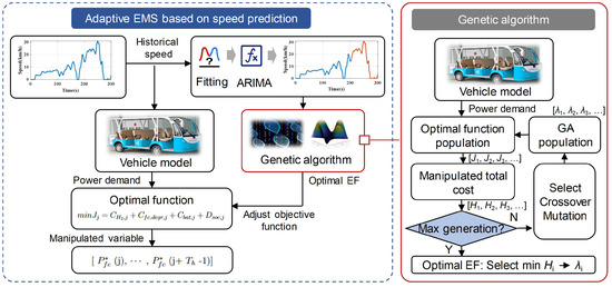 Despite the significant progress made in EMSs for FCHEVs, most existing studies tend to focus either on enhancing fuel economy or improving power response, while few simultaneously address the combined impact of fuel cell and battery aging on long-term economic performance [51]. This study introduces an EMS framework that combines ARIMA-based real-time speed prediction with GA-based equivalent factor (EF) optimization. This framework is designed to not only maintain system responsiveness and predictive stability under uncertain traffic conditions but also to holistically optimize fuel consumption and aging-related economic losses.