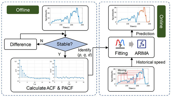 Here, represents the predicted vehicle speed at time t, is the mean term, represents the autoregressive coefficients reflecting the influence of p past observations, represents the moving average coefficients capturing the influence of q past forecast errors, and denotes the white noise error term. Therefore, the ARIMA model is denoted by (p, d, q). Figure 5 illustrates the framework of the proposed ARIMA algorithm for short-term speed prediction. The modeling process of ARIMA model usually includes the following steps: