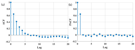Figure 6a,b illustrate the ACF and PACF of the velocity profile observed in real-world driving conditions. Based on the analysis of the ACF and PACF plots in Figure 6, the optimal values of p and q for the model are determined to be 3 and 2, respectively.