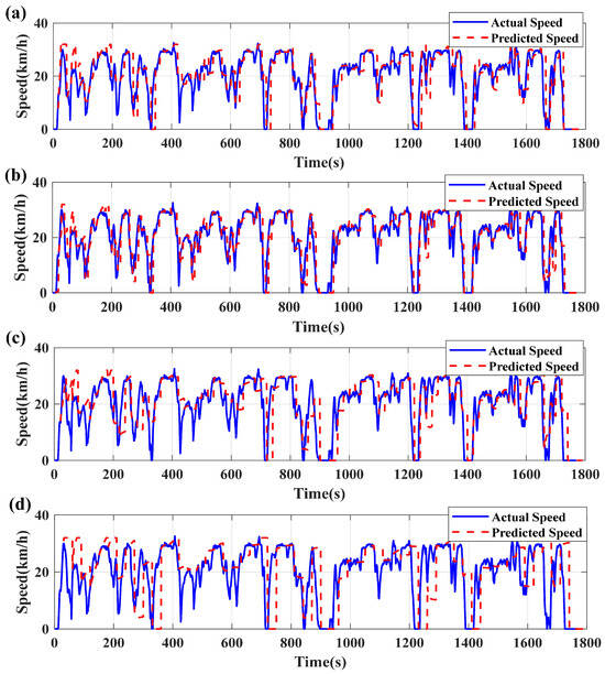 Traditional vehicle speed prediction algorithms typically require a large amount of offline data for pre-training to achieve accurate speed forecasts [56]. However, since vehicle speeds vary significantly under different road conditions, many researchers have improved prediction accuracy by categorizing driving speeds into several standard driving conditions. Separate speed prediction models are then trained using driving data corresponding to each condition, and the appropriate model is selected based on the vehicle’s current driving condition. Although this approach can enhance prediction accuracy to some extent, it relies on precisely determining the current driving condition before making predictions. Due to factors such as driver behavior and specific road conditions, actual driving conditions may deviate from the predefined standards, significantly reducing the accuracy of speed prediction. To overcome this challenge, the algorithm proposed in this paper employs a sliding window approach to fit a predictive model using real-time driving information, eliminating the need for predefined conditions and offline training. By doing so, the algorithm adapts to the unique driving cycles of individual vehicles while improving prediction accuracy, regardless of deviations from standard conditions.