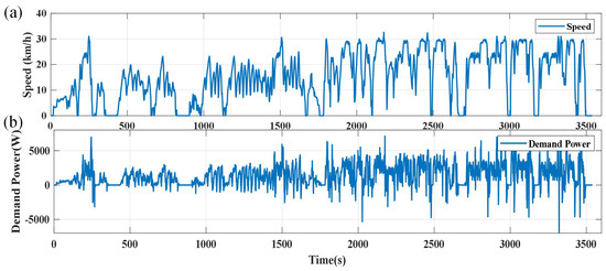 As shown in Figure 12a, the real-world driving conditions within an industrial park are still selected as the test driving scenario. Figure 12b illustrates the power output required from the fuel cell and battery systems to meet the vehicle’s driving demands. The energy distribution results for different EF update intervals are shown in Figure 13.