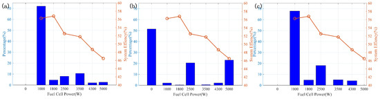 Distribution of FC working status. (a) T-ECMS. (b) Rule-based EMS. (c) GA-ECMS.