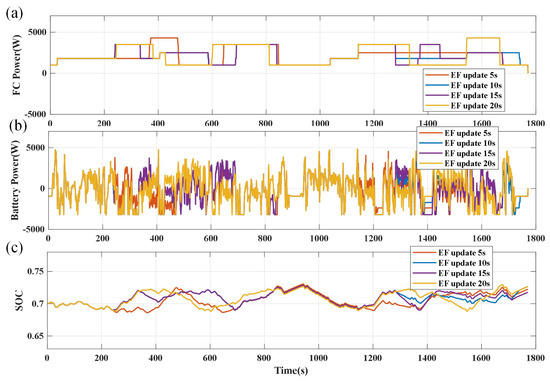 Comparison of energy management for different EF update times. (a) FC power. (b) Battery power. (c) SOC of the battery.